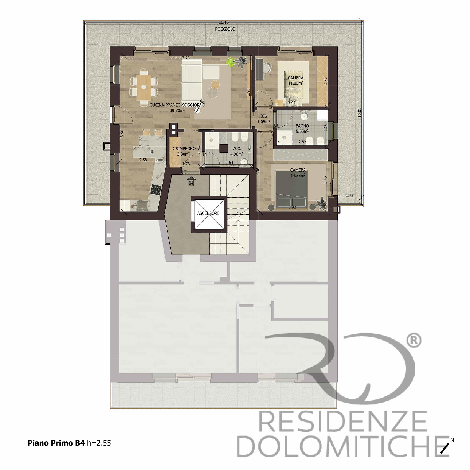 L’appartamento denominato B4 di circa 114 mq calpestabili si trova al primo piano ed è composto da un ingresso con disimpegno, un’ampia cucina open space con soggiorno, due camere da letto, due bagni e un ampio terrazzo. L’appartamento è dotato di un ascensore condominiale.