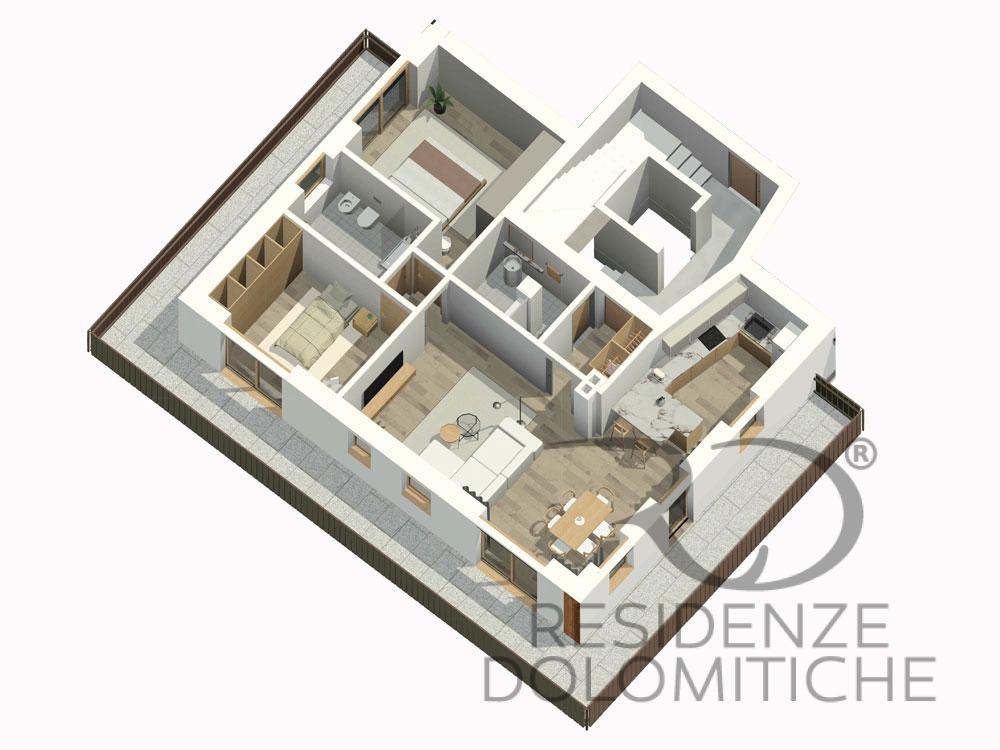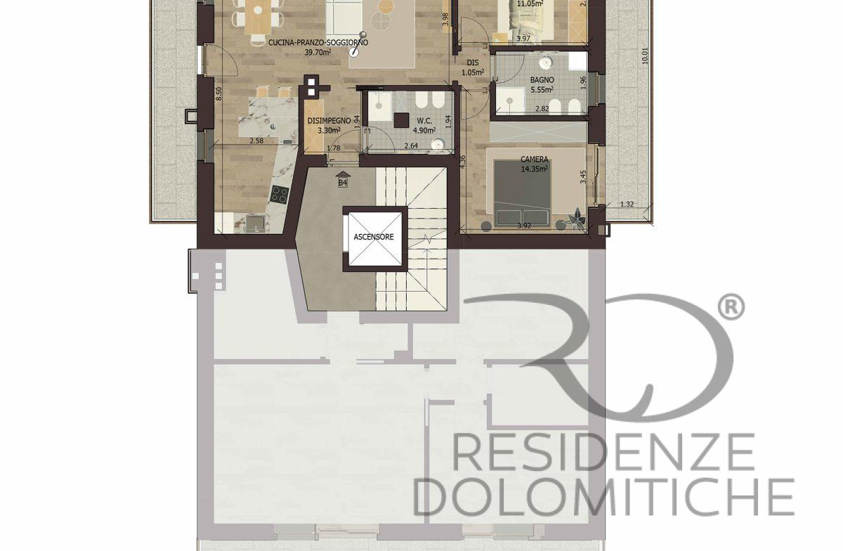 L’appartamento denominato B4 di circa 114 mq calpestabili si trova al primo piano ed è composto da un ingresso con disimpegno, un’ampia cucina open space con soggiorno, due camere da letto, due bagni e un ampio terrazzo. L’appartamento è dotato di un ascensore condominiale.