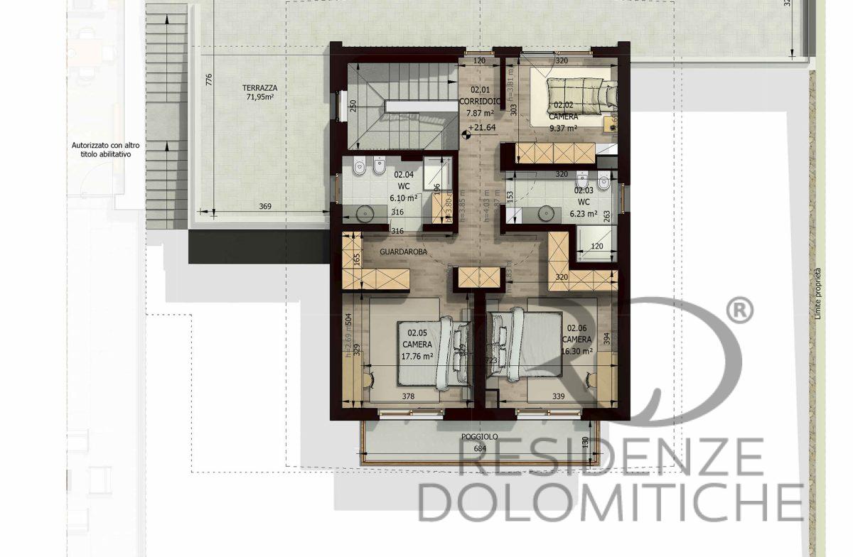 L’edificio contrassegnato con la lettera E è una villetta unifamiliare di circa 220 mq più scoperto, composta da un interrato con cantina e posto auto in garage condominiale; un piano terra con ingresso, guardaroba, ampio soggiorno, un bagno, lavanderia; al primo piano/sottotetto tre camere complete di terrazzino con affaccio sul lago del Centro Cadore, e ulteriori due bagni.