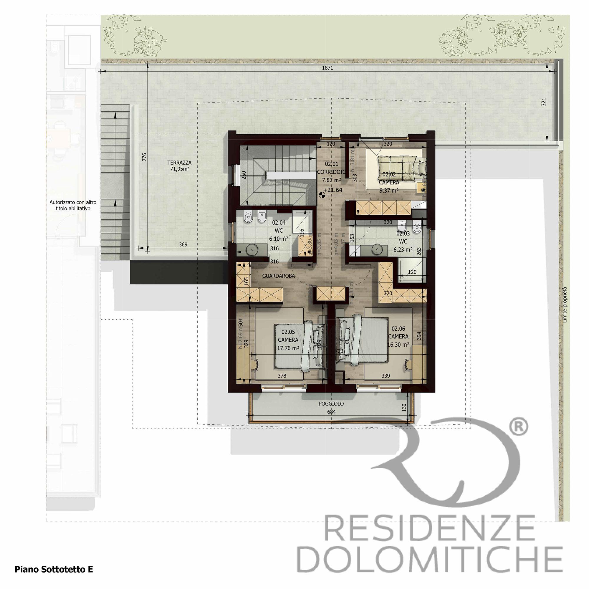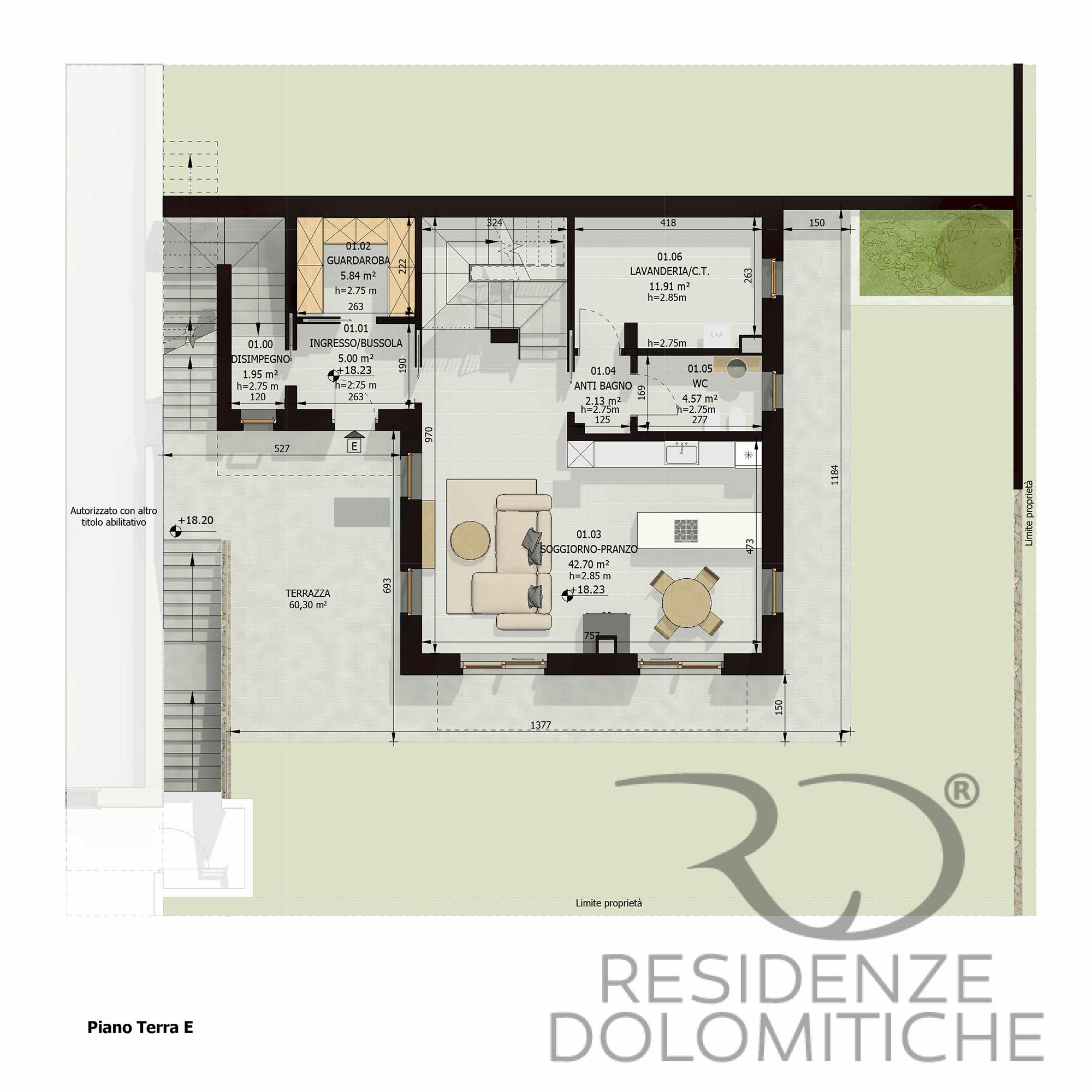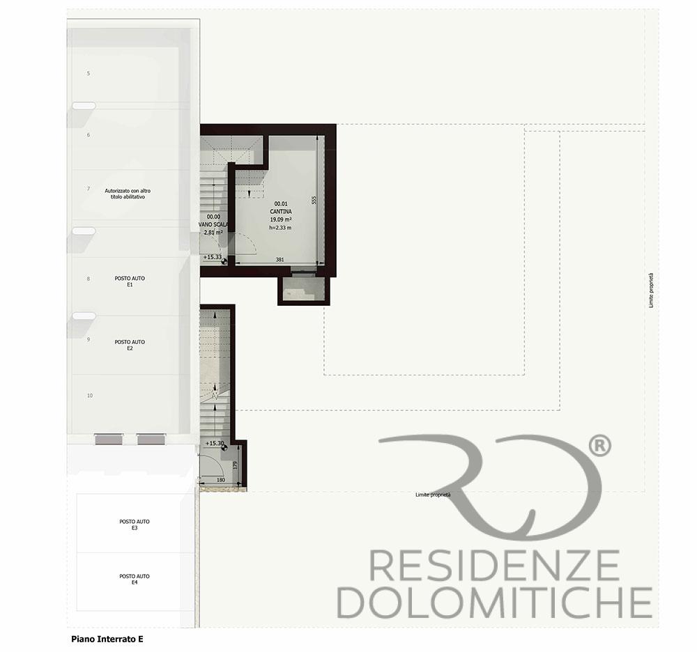 L’edificio contrassegnato con la lettera E è una villetta unifamiliare di circa 220 mq più scoperto, composta da un interrato con cantina e posto auto in garage condominiale; un piano terra con ingresso, guardaroba, ampio soggiorno, un bagno, lavanderia; al primo piano/sottotetto tre camere complete di terrazzino con affaccio sul lago del Centro Cadore, e ulteriori due bagni.